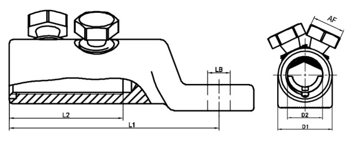 | Tipo | Sección transversal del cable (mm²) | Diámetro del orificio de la empuñadura | Dimensiones (mm) | Tamaño de la cabeza (AF) | Cantidad de pernos de contacto | |||