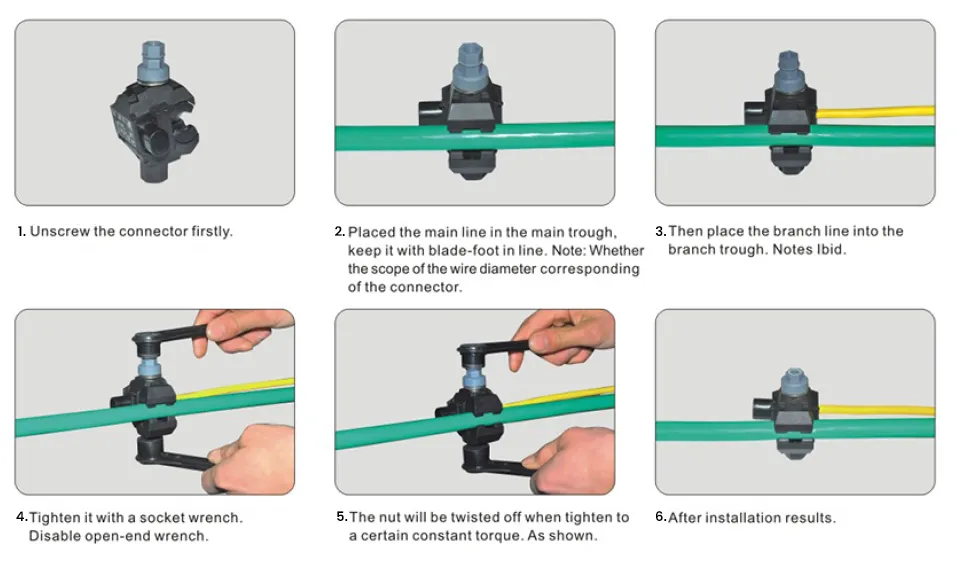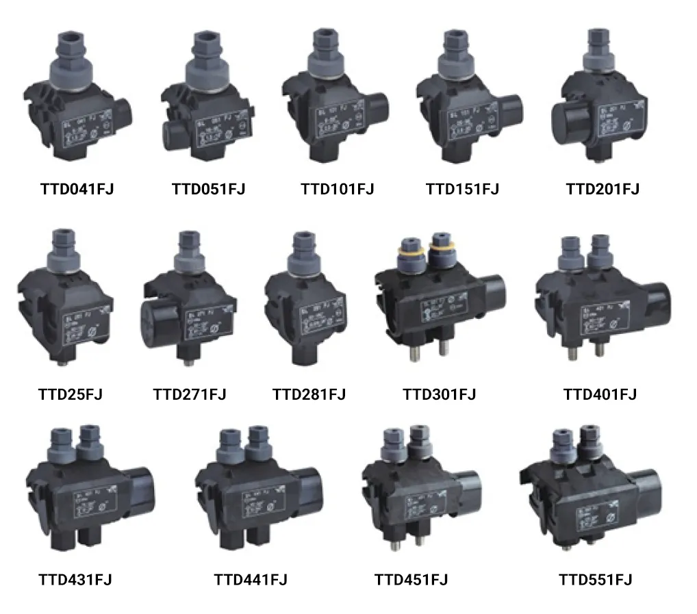 Se utiliza para la conexión de derivación de cable aislado para el sistema de distribución de edificios, conexión de cables aislados aéreos de baja tensión, conexión de derivación de cable de entrada de servicio aislado de baja tensión, sistema de distribución de alumbrado público, etc.